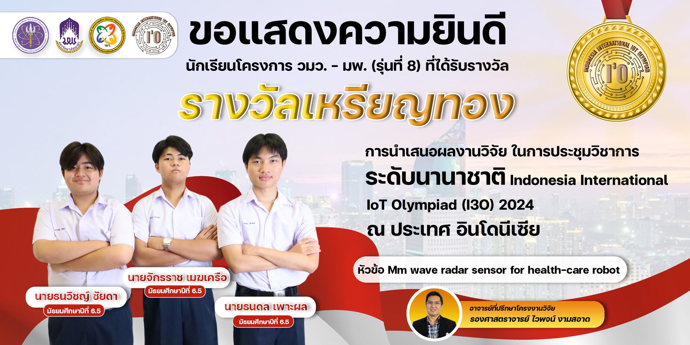 ขอแสดงความยินดีกับนักเรียนที่ได้รับรางวัล "เหรียญทอง" ในการประชุมวิชาการระดับนานาชาติ “Indonesia International IoT Olympiad (I3O) 2024” ประเทศอินโดนีเซีย ในรูปแบบออนไลน์ ระหว่างวันที่ 25 – 29 มิถุนายน 2567