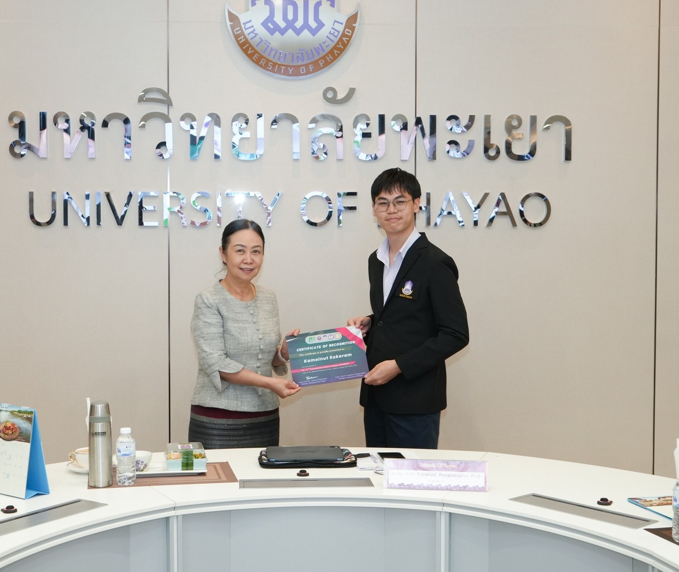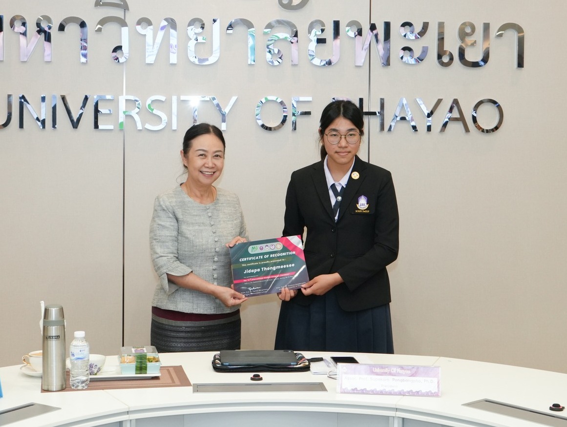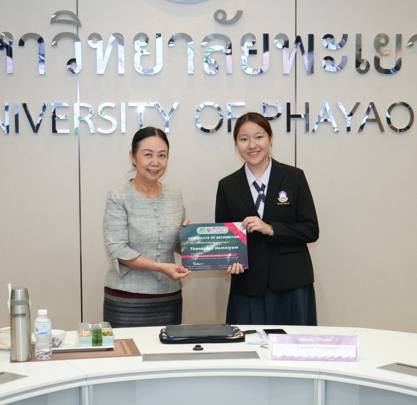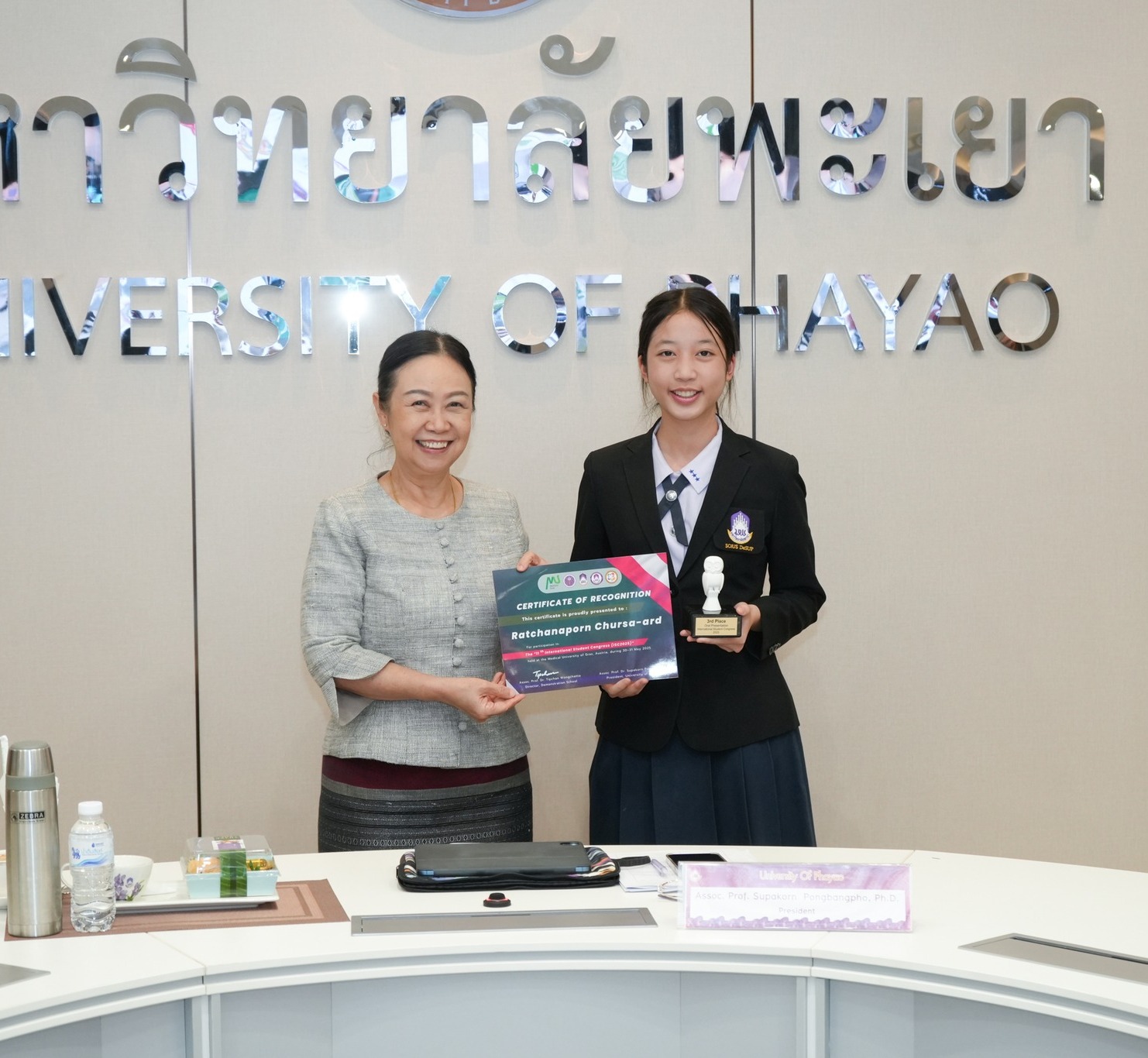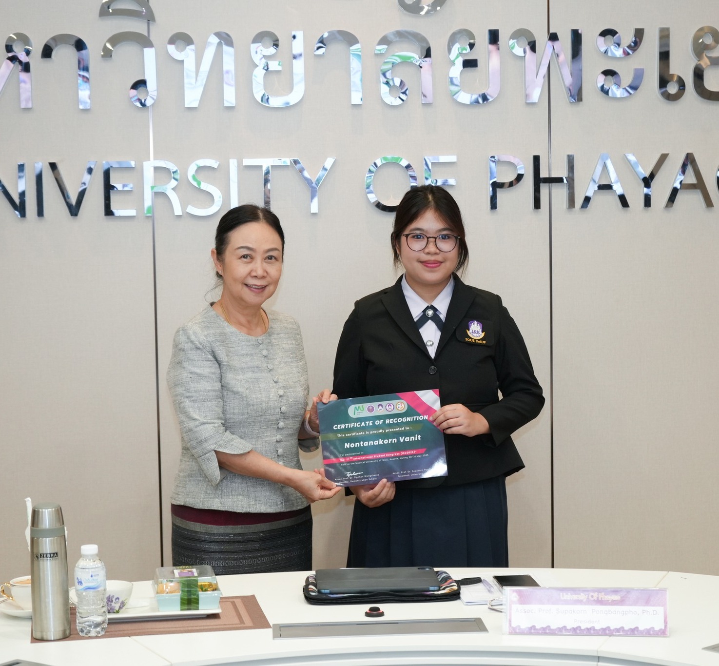 รศ.ดร.ทิพย์จันทร์ วงศ์จันทร์ตา ผู้อำนวยการโรงเรียน นำนักเรียน โครงการ วมว. 8 ผู้กล้า บินข้ามน่านฟ้านำเสนอผลงานทางวิชาการ ณ ประเทศออสเตรีย และอาจารย์ที่ปรึกษา เข้ารับเกียรติบัตร จาก รศ.ดร.สุภกร พงศบางโพธิ์ อธิการบดี มหาวิทยาลัยพะเยา โดยอธิการบดีได้แสดงความยินดีแก่นักเรียน ในโอกาสเข้าร่วมนำเสนอผลงานทางวิชาการ ในงานประชุมวิชาการระดับนานาชาติ The 11th The International Student Congress (ISC 2025) ณ มหาวิทยาลัยทางการแพทย์แห่งกราซ ประเทศออสเตรีย เป็นการนำชื่อเสียงและศักยภาพของนักเรียนไปเผยแพร่สู่นานาชาติให้เป็นที่รู้จัก