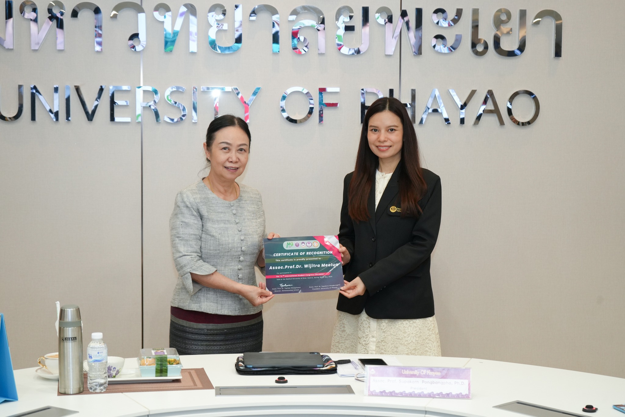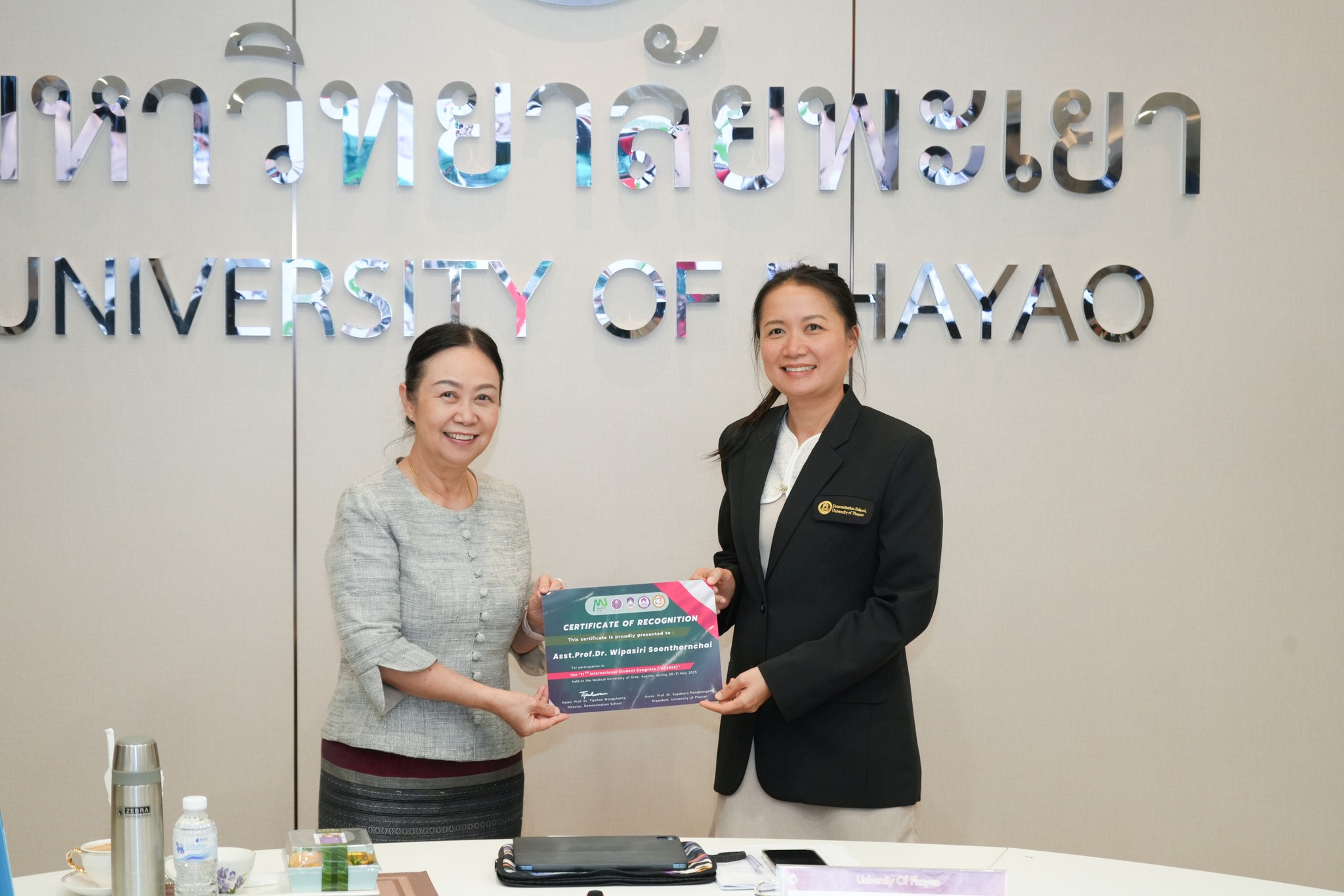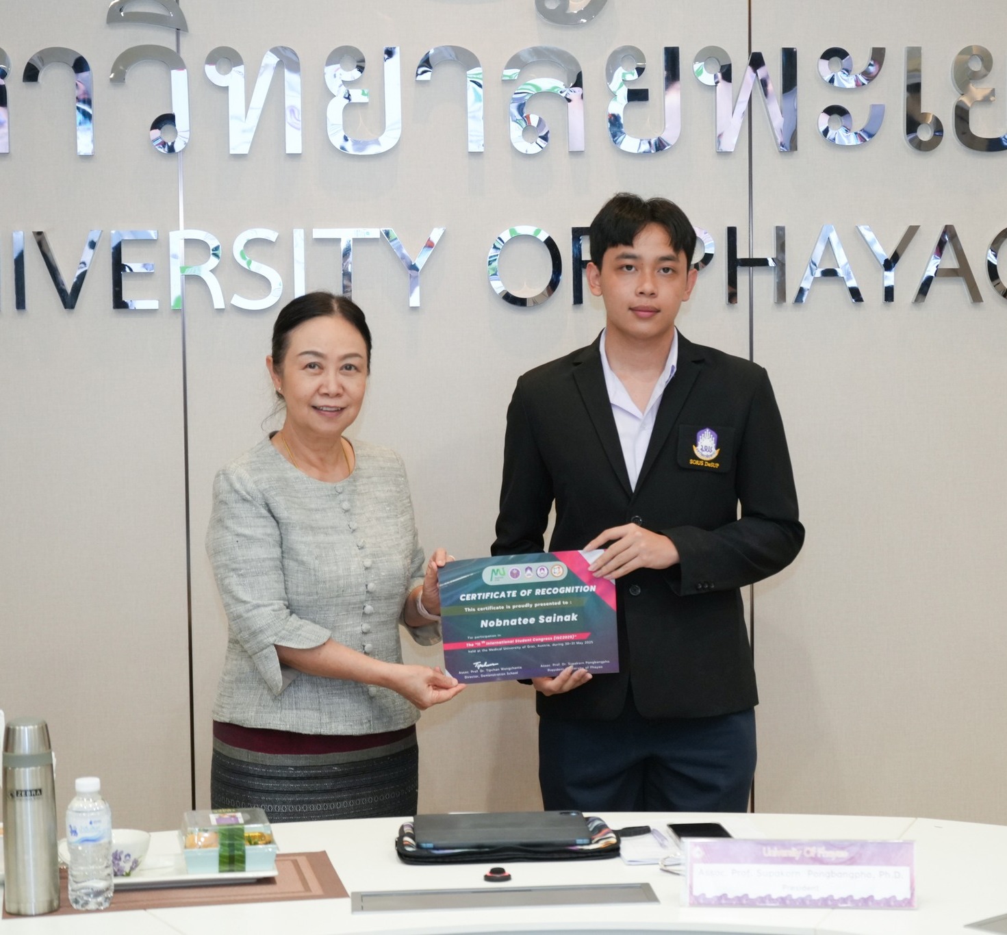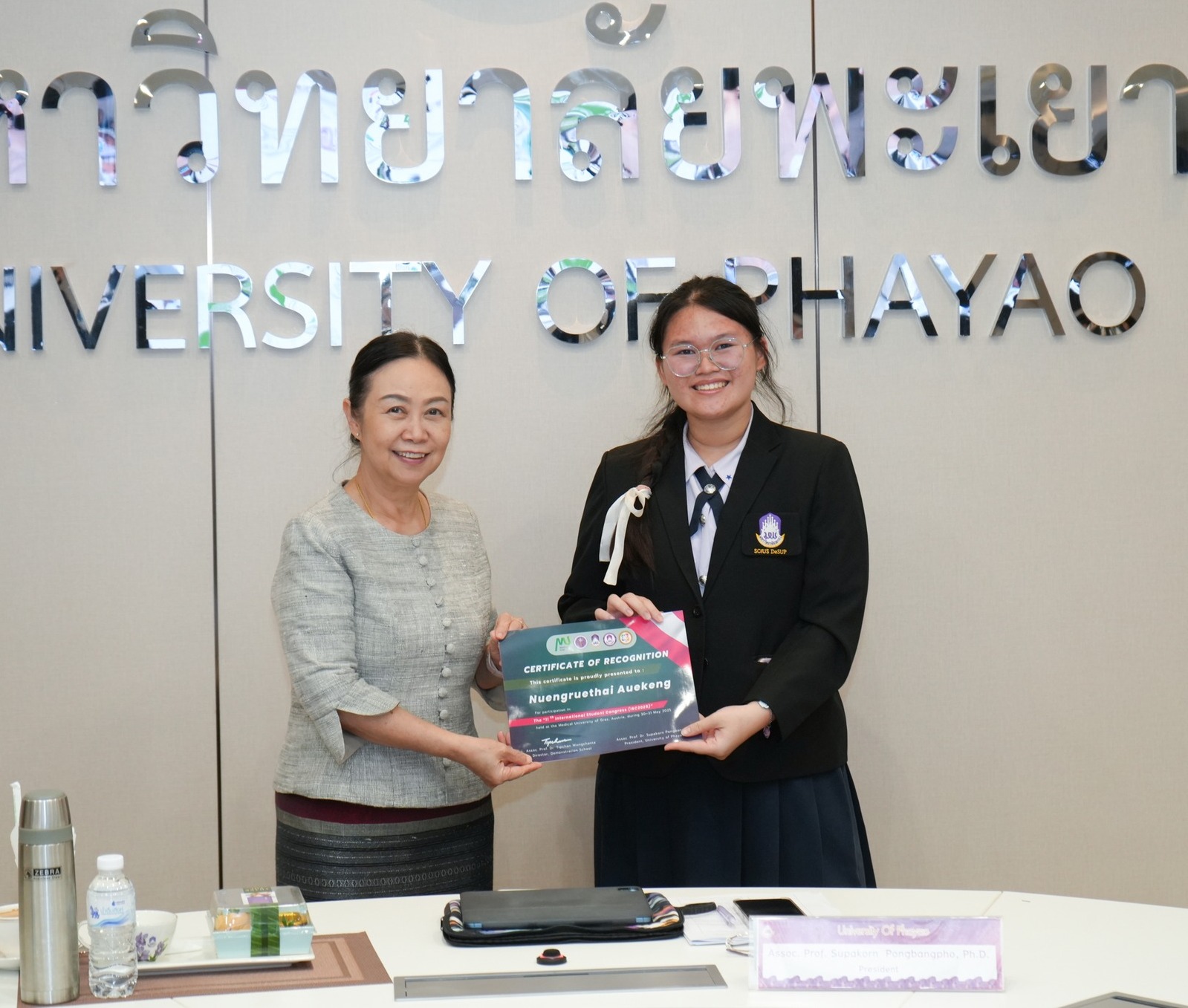 รศ.ดร.ทิพย์จันทร์ วงศ์จันทร์ตา ผู้อำนวยการโรงเรียน นำนักเรียน โครงการ วมว. 8 ผู้กล้า บินข้ามน่านฟ้านำเสนอผลงานทางวิชาการ ณ ประเทศออสเตรีย และอาจารย์ที่ปรึกษา เข้ารับเกียรติบัตร จาก รศ.ดร.สุภกร พงศบางโพธิ์ อธิการบดี มหาวิทยาลัยพะเยา โดยอธิการบดีได้แสดงความยินดีแก่นักเรียน ในโอกาสเข้าร่วมนำเสนอผลงานทางวิชาการ ในงานประชุมวิชาการระดับนานาชาติ The 11th The International Student Congress (ISC 2025) ณ มหาวิทยาลัยทางการแพทย์แห่งกราซ ประเทศออสเตรีย เป็นการนำชื่อเสียงและศักยภาพของนักเรียนไปเผยแพร่สู่นานาชาติให้เป็นที่รู้จัก