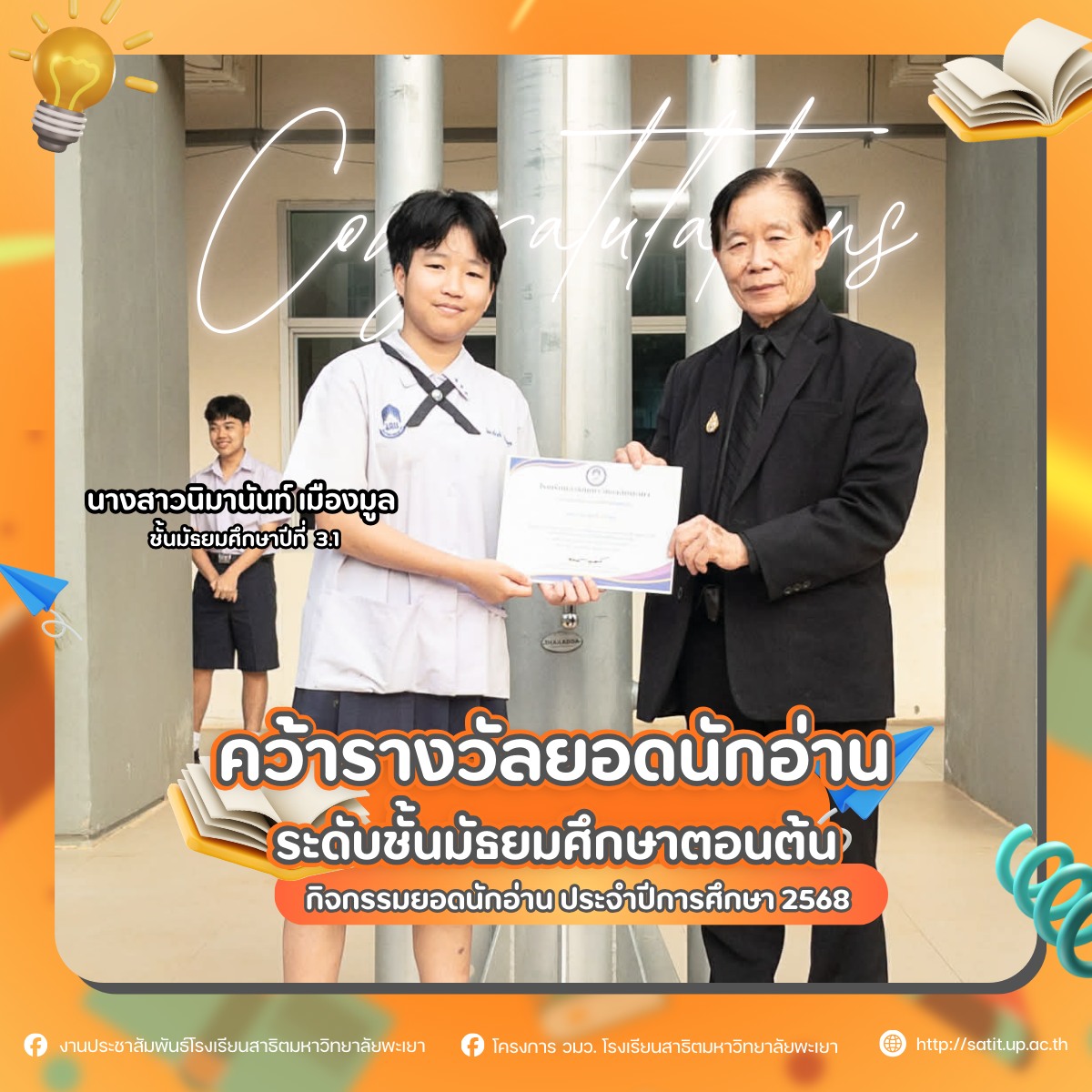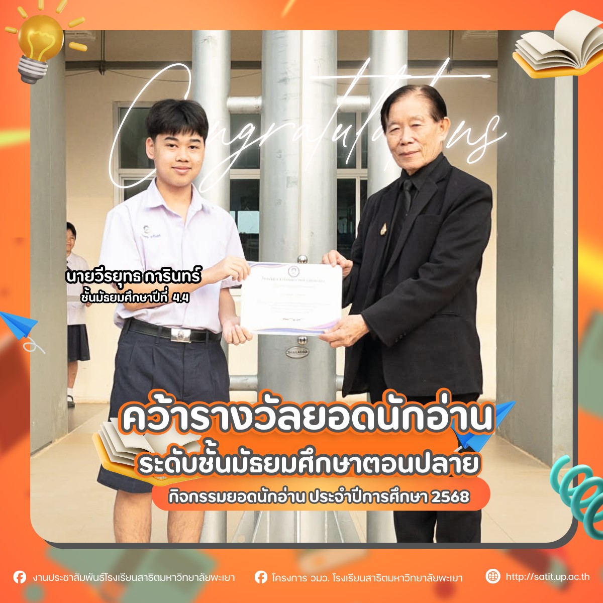 โรงเรียนสาธิตมหาวิทยาลัยพะเยา จัดกิจกรรม “ยอดนักอ่าน” ประจำปีการศึกษา 2568 เพื่อส่งเสริมและปลูกฝังนิสัยรักการอ่านให้แก่นักเรียนอย่างยั่งยืน โดยเล็งเห็นว่าการอ่านเป็นรากฐานสำคัญของการแสวงหาความรู้ด้วยตนเอง และเป็นทักษะที่ช่วยพัฒนาศักยภาพทางการเรียนรู้ในทุกด้าน ในปีการศึกษา 2568 นี้ ผู้ที่ได้รับรางวัลยอดนักอ่าน ได้แก่ ระดับชั้นมัธยมศึกษาตอนต้น นางสาวนิมานันท์ เมืองมูล ชั้นมัธยมศึกษาปีที่ 3.1 และระดับชั้นมัธยมศึกษาตอนปลาย นายวีรยุทธ การินทร์ ชั้นมัธยมศึกษาปีที่ 4.4