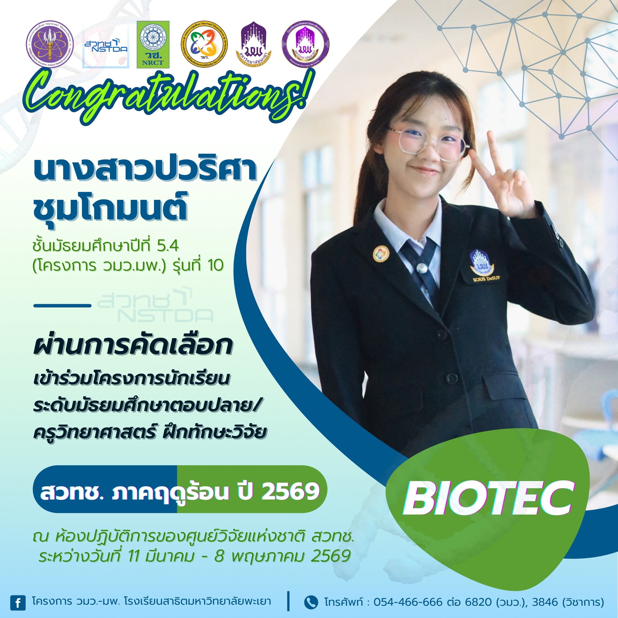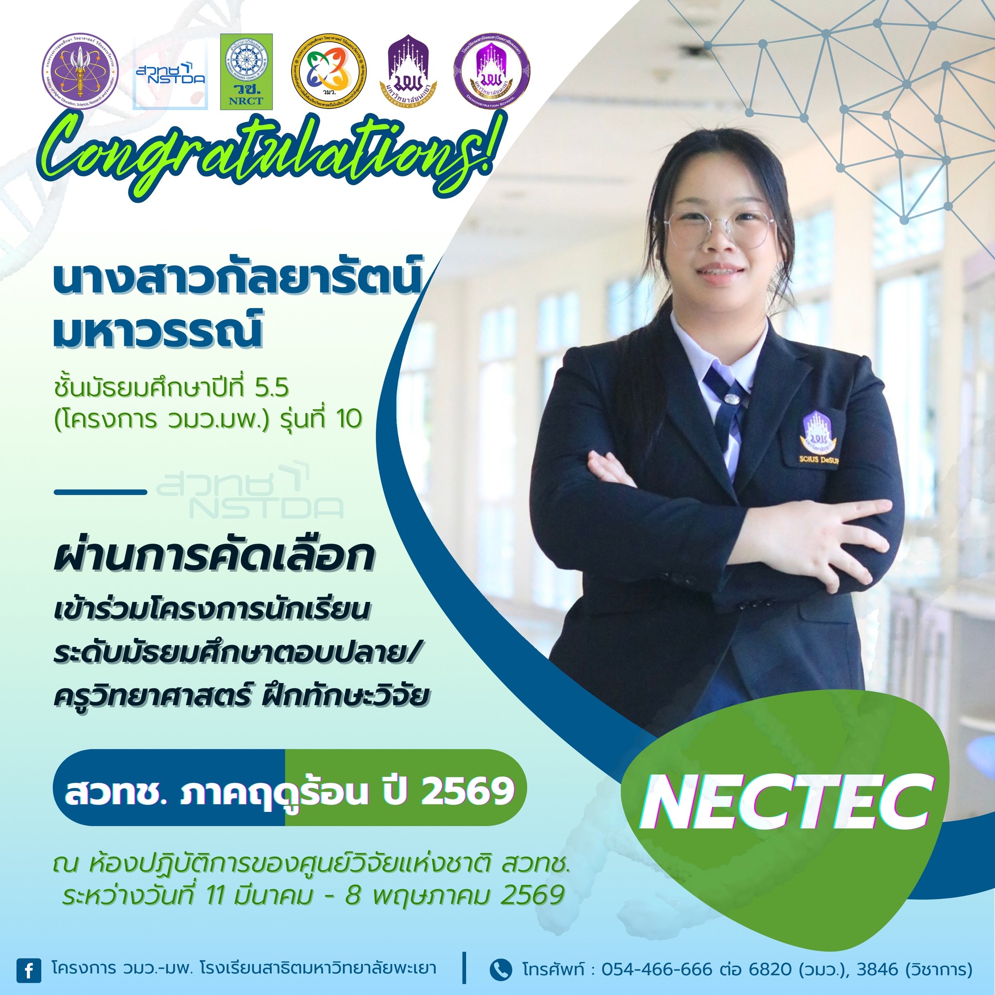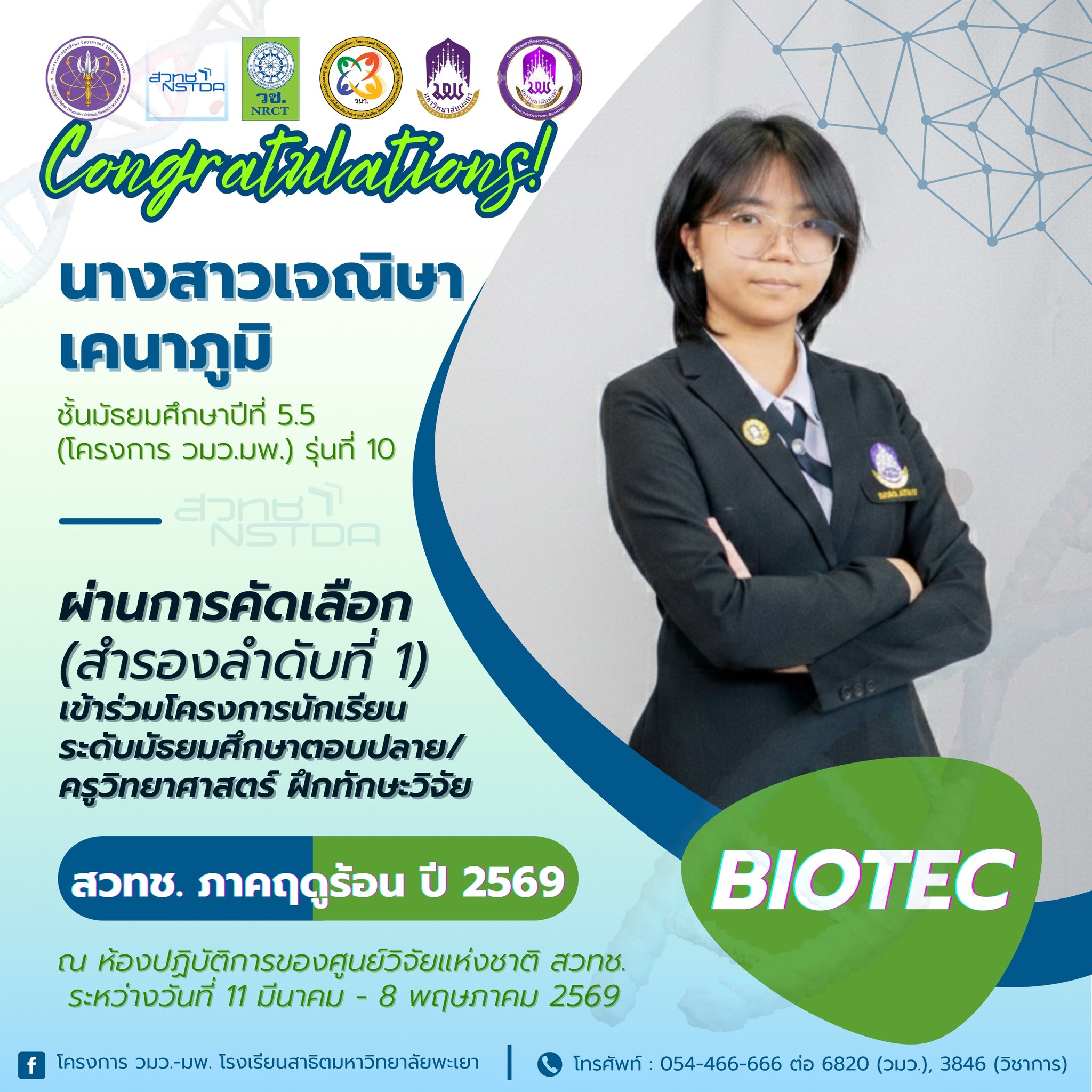 ที่ผ่านการคัดเลือกเข้าร่วมโครงการนักเรียนระดับมัธยมศึกษาตอบปลาย/ครูวิทยาศาสตร์ ฝึกทักษะวิจัย ณ ห้องปฏิบัติการของศูนย์วิจัยแห่งชาติ สวทช. ภาคฤดูร้อน ปี 2569 ระหว่างวันที่ 11 มีนาคม - 8 พฤษภาคม 2569