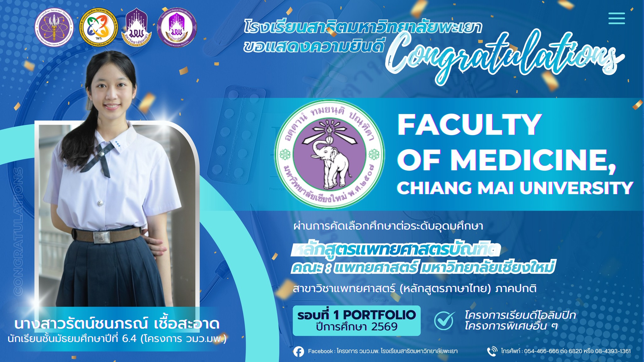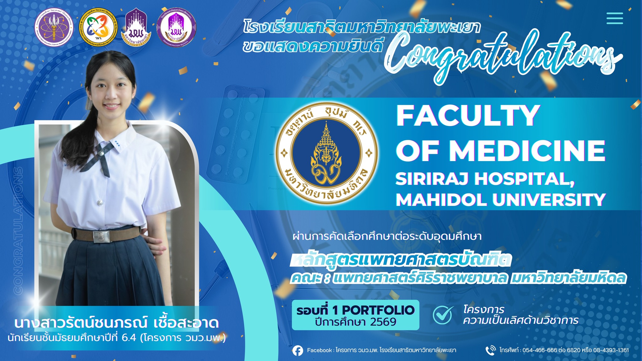 14 เมษายน 2569 นางสาวรัตน์ชนภรณ์ เชื้อสะอาด ผ่านการคัดเลือกคณะ แพทยศาสตร์ศิริราชพยาบาล อ่าน 202 โรงเรียนสาธิตมหาวิทยาลัยพะเยา ขอแสดงความยินดีกับนักเรียน . นางสาวรัตน์ชนภรณ์ เชื้อสะอาด พี่เชอรี่ (ชั้นมัธยมศึกษาปีที่ 6.4) ห้องเรียนวิทยาศาสตร์ โครงการ วมว.มพ. (รุ่นที่ 9) นักเรียนทุนโครงการ วมว. รุ่นที่ 16 . ในโอกาสผ่านการคัดเลือกเข้าศึกษาต่อระดับอุดมศึกษา ปีการศึกษา 2569 หลักสูตรแพทยศาสตรบัณฑิต คณะ : แพทยศาสตร์ศิริราชพยาบาล มหาวิทยาลัยมหิดล รอบที่ 1 Portfolio ปีการศึกษา 2569 (โครงการความเป็นเลิศด้านวิชาการ)